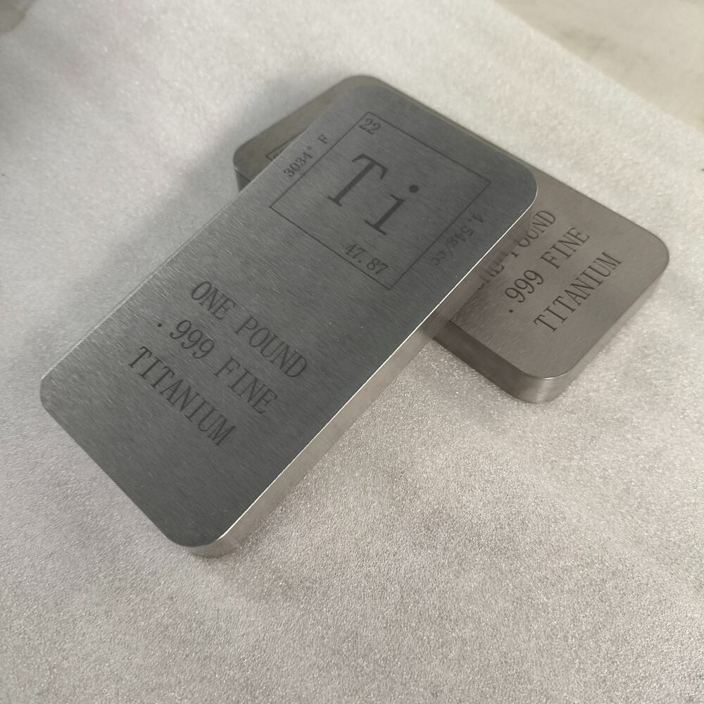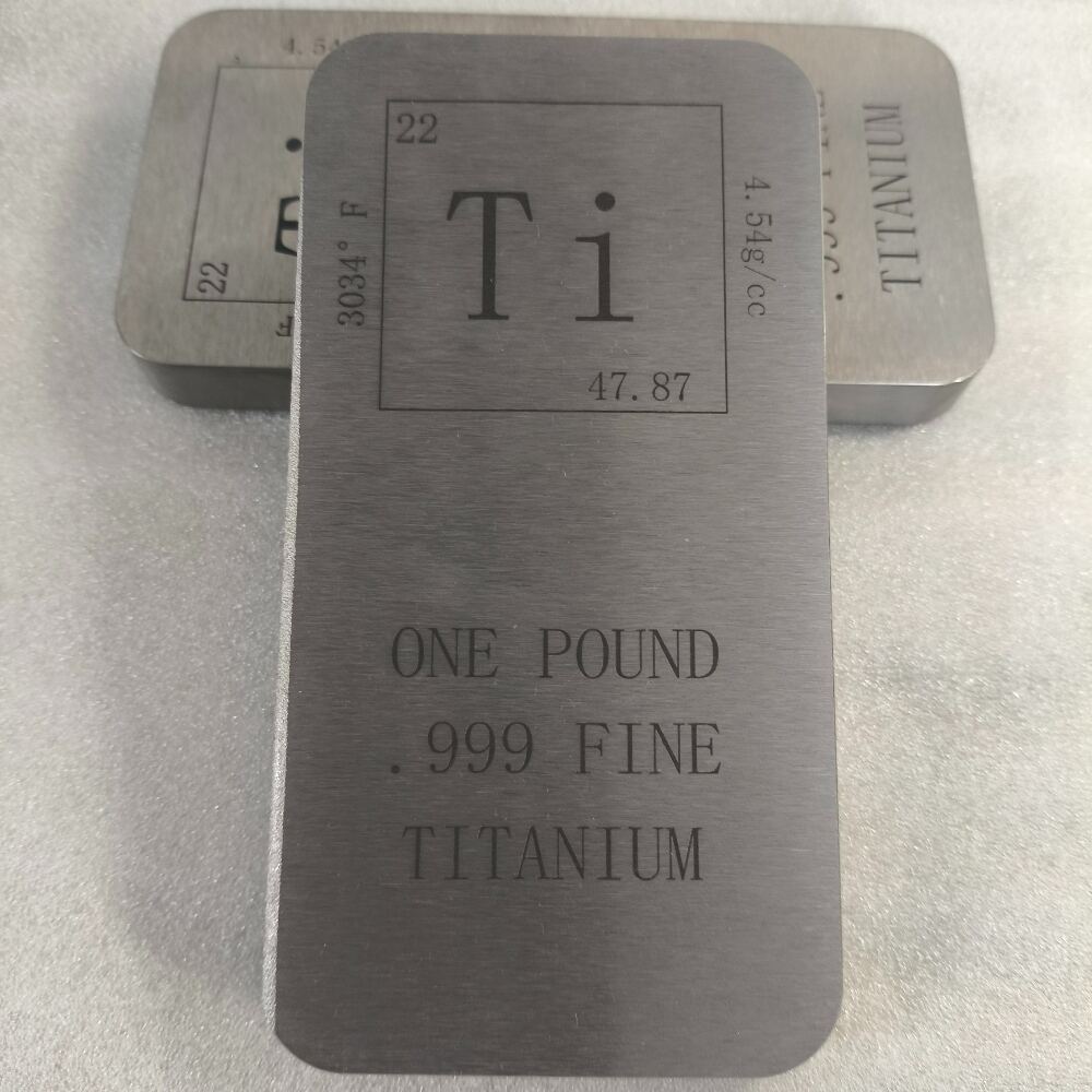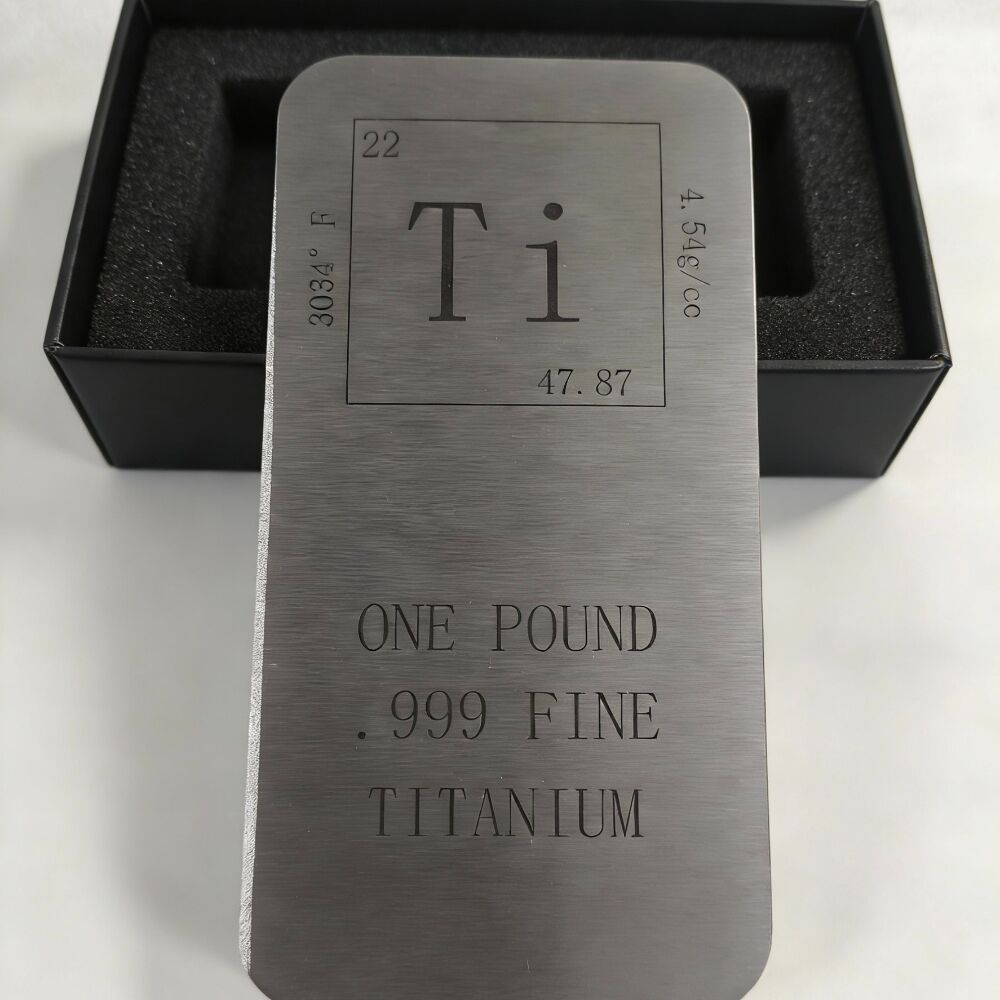 Metals Titanium Bar - 1 Kilo Laser Engraved are made of fine 99 titanium. The front of the bar features the Element Symbol - Ti - Atomic Number - 22 - Atomic Mass - 47.87 - Melting Point - 1660°C - Density - 4.54g/cc and the words "One Kilogram .999 Fine Titan". The back of the strip is blank, if u have design for your logo, aslo we can laser engraving with the surface, this style all four corners have chamfers.It is R10, if you have special style we can customize.